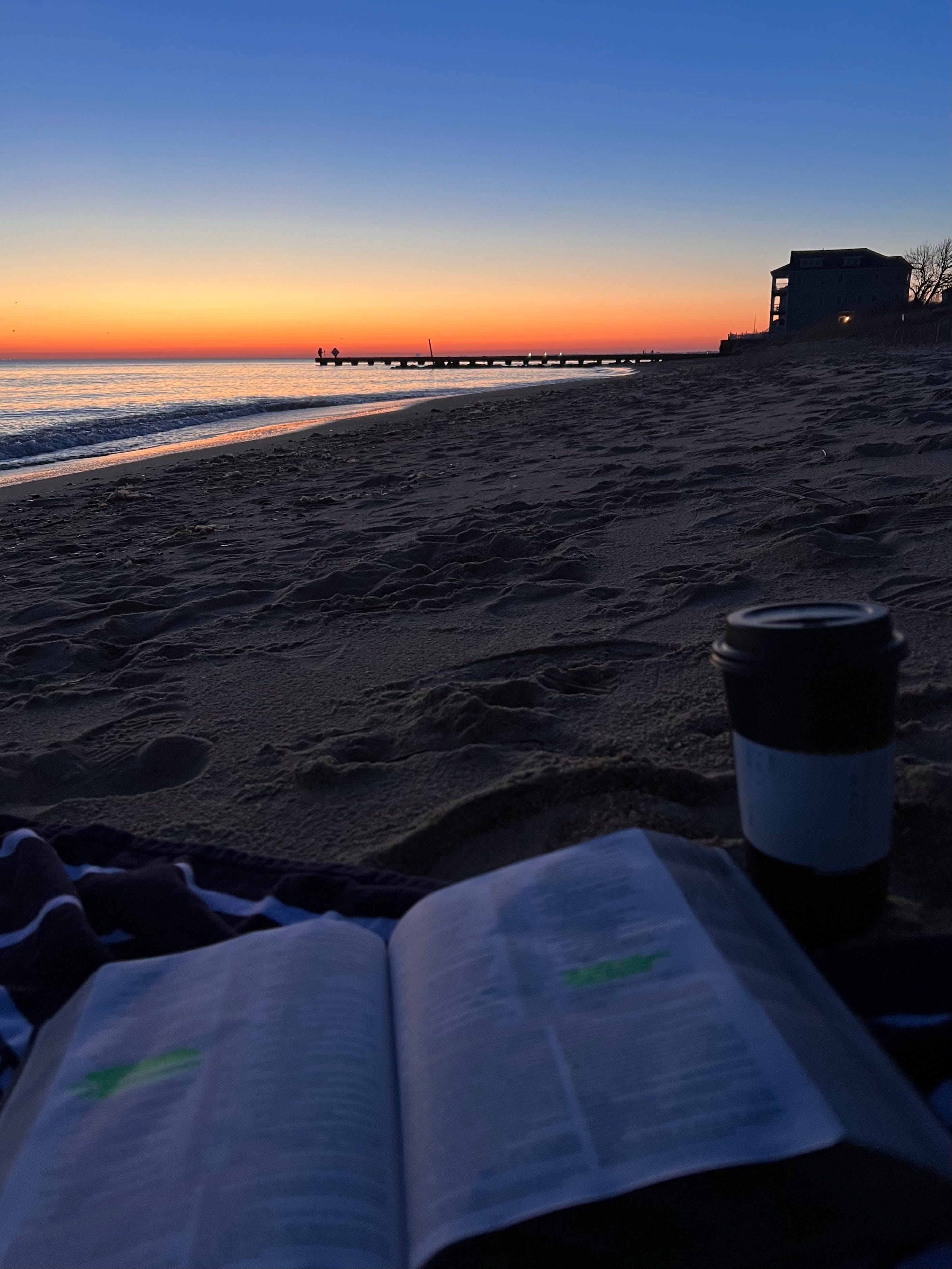 I stop for coffee and a bagel, then pull into the beach parking lot at exactly 5:55.